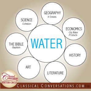 We had added circles for history, literature, and even art, when one student said, “Water is beautiful!” We filled the circles with many facts and figures. When we only had one circle left I asked what we should put there and one student suggested, “Put the Bible in that one.” So we went around the room and had each person think of one mention of water in the Bible. We added the flood, baptism, turning water to wine, parting the red sea, and so on. Then, the last student brought up creation and that water was created before land. He wondered how that could be. How can you have an ocean without land forming the bottom of the ocean? This launched a discussion that went back to the properties of water listed in the science section. Could cohesion have allowed water to form a sphere in space? Would it create its own gravity? What would that have been like?