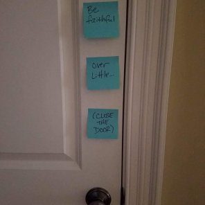 It has improved. But still I occasionally (okay, semi-weekly) find the door nearly closed instead of closed. Today, I was trying a new tactic by spreading out my message across three separate and colorful sticky notes, with the added authority of a Biblical reference.